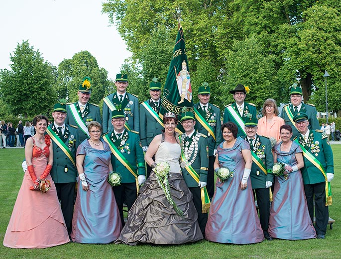 v.l. Zeremonienmeisterpaar Claudia und Peter Brenke, Kronprinzenpaar Martina und Reinhold Giesguth, Königspaar Cornelia und Willi Hoff, Apfelprinzenpaar Manuela und Klaus Mohr, Zepterprinzenpaar Michaela und Heinz-Jürgen Schmitt h.l. Kommandeur Dieter Koch, h.r. Königspaar des Vorjahres Andreas und Marita Brück, Oberst Michael Pavlicic