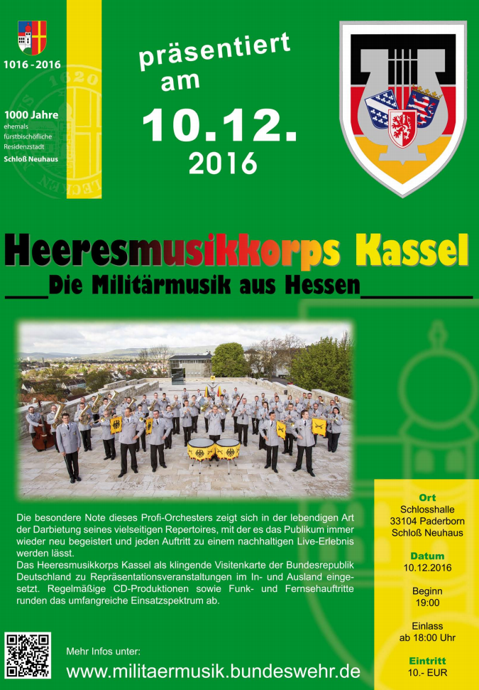 Macht reichlich Werbung für dieses großartige Konzert. Das Heeresmusikkorps Kassel war schon 2014 bei der "Woche der Militärmusik" mannstark in Schloß Neuhaus dabei. Mehr zum Heeresmusikkorps findet ihr unter: www.militaermusik.bundeswehr.de