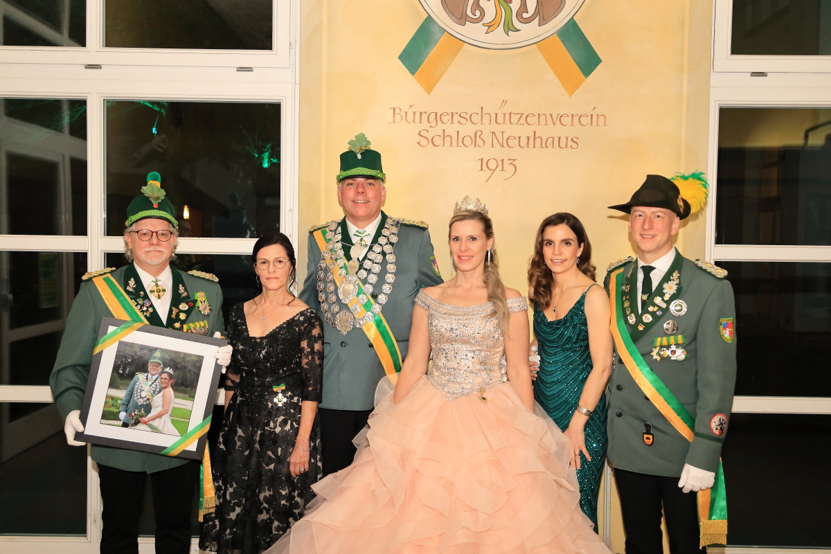 Um 20.00 Uhr erfolgte der Einmarsch des Hofstaates. In seiner Begrüßung würdigte Oberst Markus Cink das bisherige Auftreten des Hofstaates in seinem bisherigen Regentschaftsjahr und freute sich auf einen ganz besonderen Königsball im 100-jährigen Bestehen der Markt-, Hatzfelder- und Schloß-Kompanie, welche gleichzeitig auch Königskompanie ist. Er freute sich zahlreiche Ehrengäste, mit Bürgermeister Michael Dreier an der Spitze, aus dem Schützenwesen, Politik und Wirtschaft und zahlreiche befreundete Schützenbruderschaften begrüßen zu dürfen und Das Königspaar Markus und Susanne Pollmeier, das Kronprinzenpaar Markus und Katrin Gockel, das Apfelprinzenpaar Boris Müller und Nadine Sander-Müller, das Zepterprinzenpaar Mike und Sharon Hirst und das Zeremonienmeisterpaar Tilla und Frank Menne freuten sich über die Blumengrüße des Bataillons. Auch die Königinnen der anwesenden Gastvereine wurden mit einem Blumenstrauß von Oberst Markus Cink begrüßt. Mit herzlichem Dank für ihr vergangenes Regentschaftsjahr wurde dem Königspaar des Schützenjahres 2023/2024 Markus und Monika Husemann unter großem Beifall der Gäste ein Erinnerungsfoto überreicht.