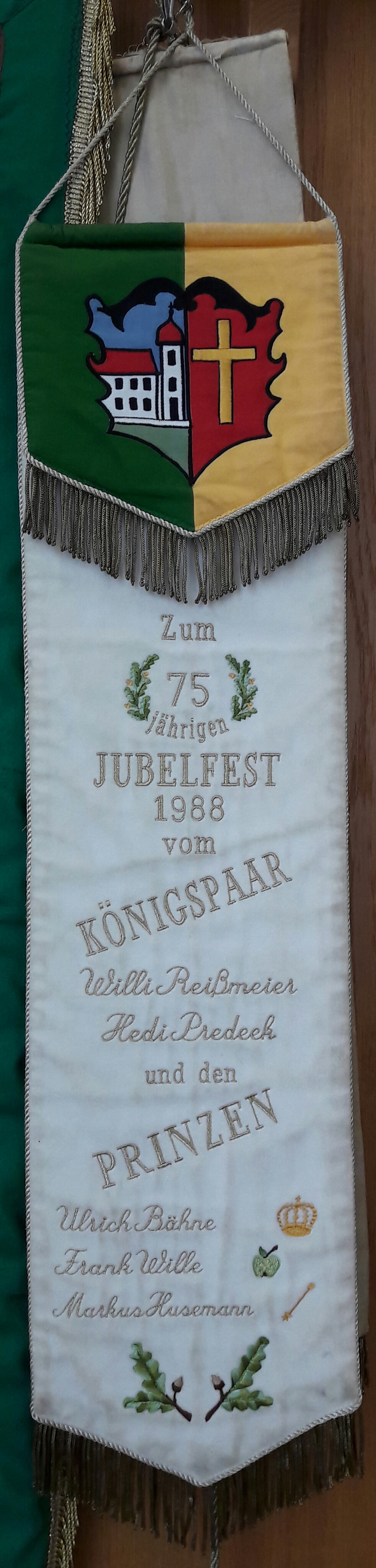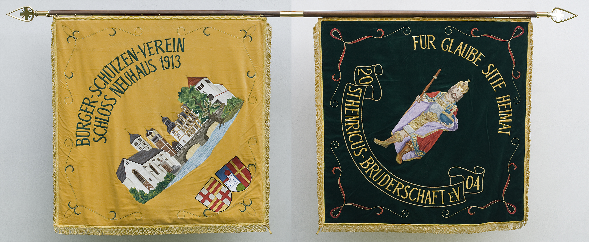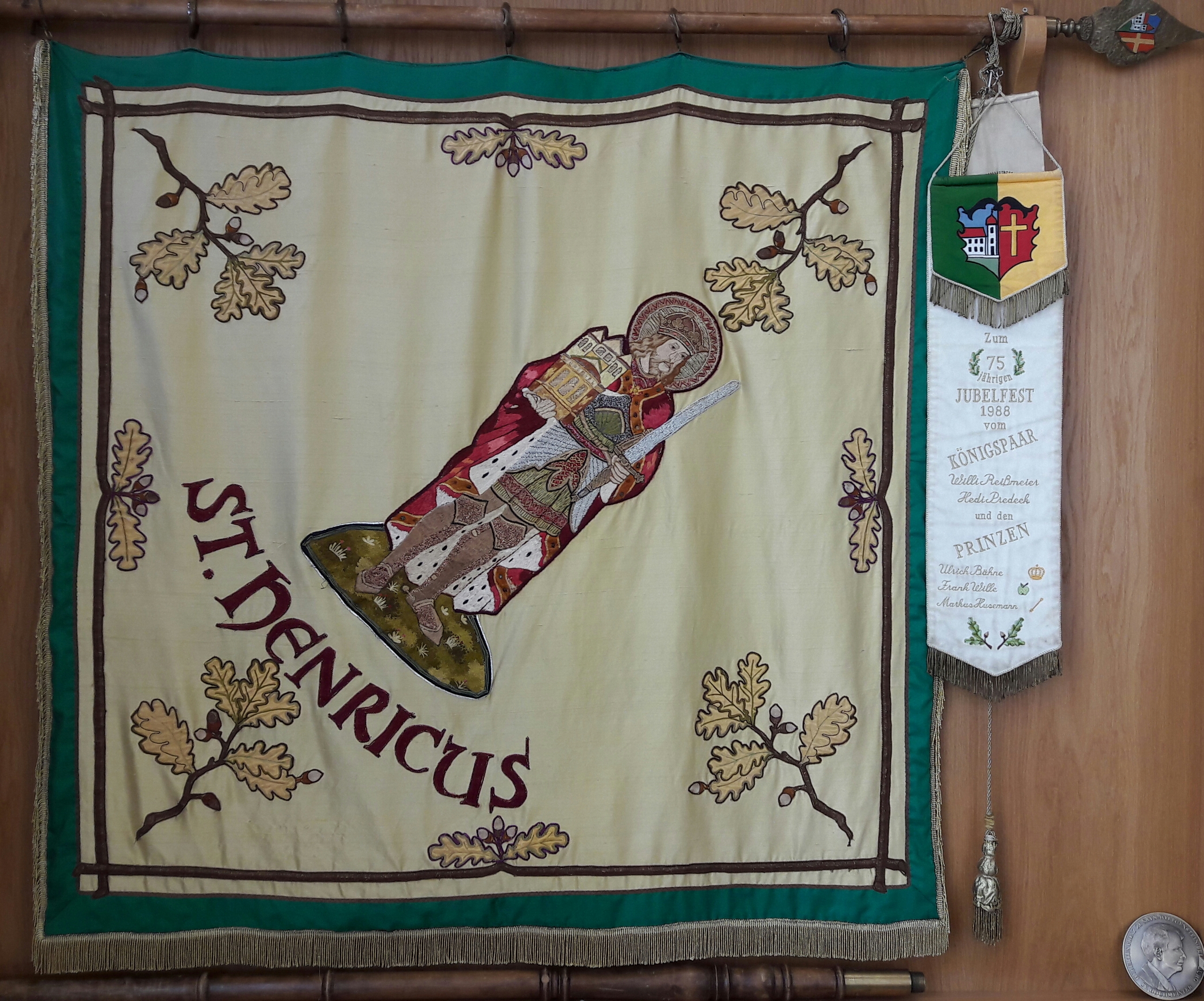Die gelbe Seite zeigt zum einen den Namenspatron der Bruderschaft; den heiligen Heinrich. In liebevollen Stickereien wurde er mit Kirche (rechter Arm) und dem Schwert (linker Arm) dargestellt. Darunter der Schriftzug "St. Henricus". Umrahmt mit Eichenlaubelementen.