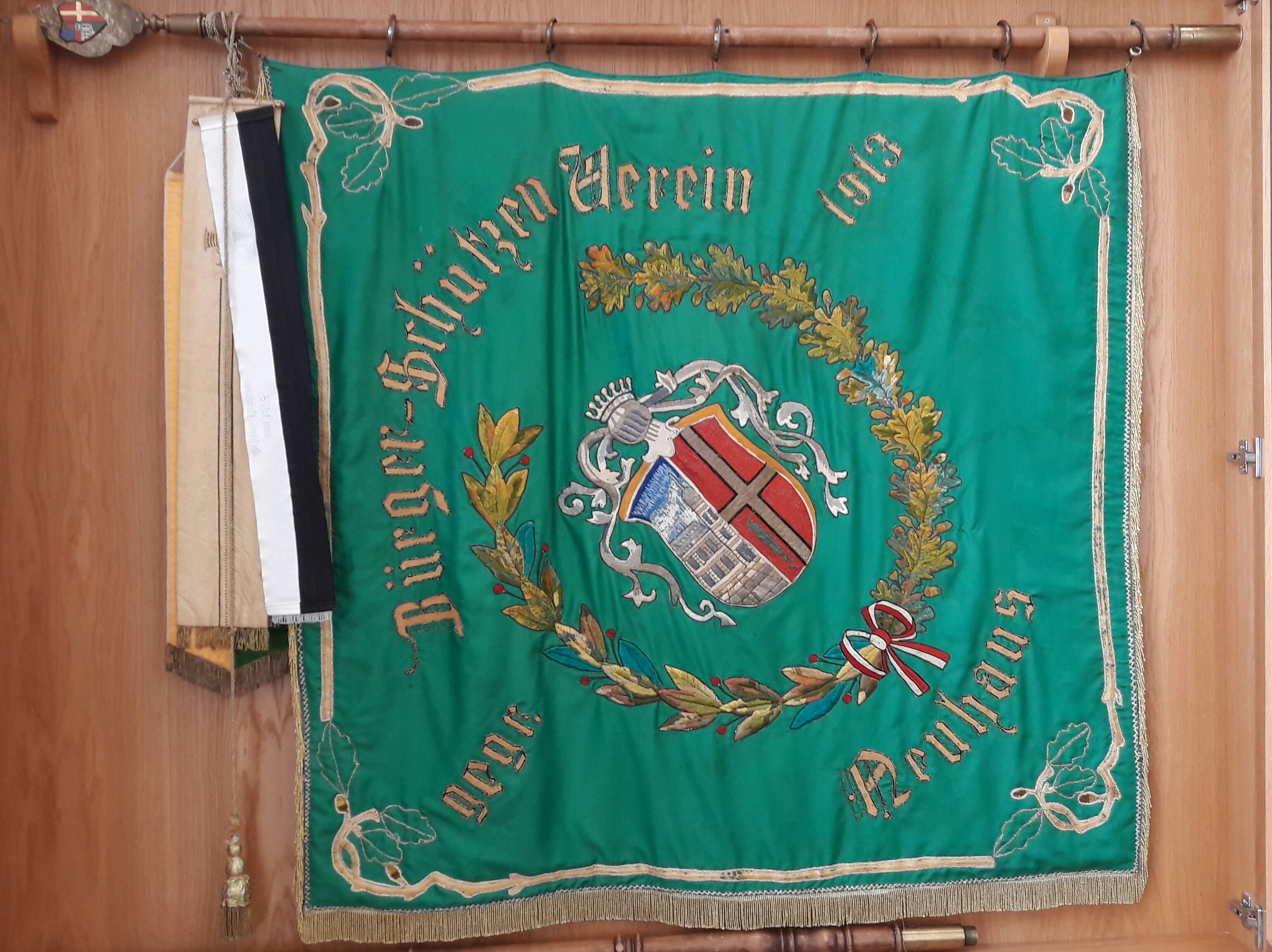 Der Ursprung und damit noch ein Großteil der Fahne stammt aus den Jahren um 1913 und zählt damit zu den ersten Errungenschaften der Bruderschaft. Wie auch die neue Fahne besteht sie aus einer grünen und einer gelben Seite. Die Fahnenspitze zeigt in Holz gefertigt das Neuhäuser Wappen, welches erst bei der Restaurierung 1987 hinzugefügt wurde.