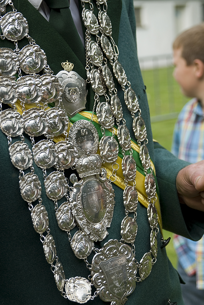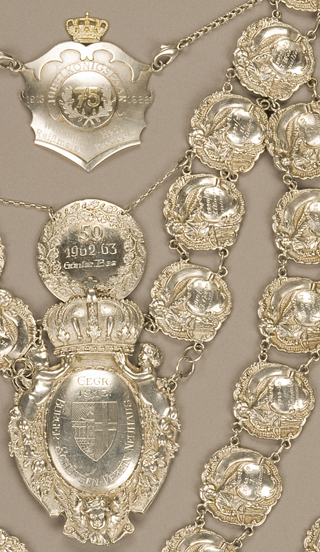 Der Ursprung der Kette reicht bis ins Jahr 1913 zur Gründung zurück. Dort wurde die "Grundkette" angeschafft. Sie bestand aus dem Herzstück mit dem Wappen, dem Namen und der Krone und weiteren Kettengliedern (eine Reihe) auf die der jeweilige Name inkl. dem Jahr graviert wurde. Im Laufe der Jahrzente kamen immer weitere Gliederketten hin zu. Die jeweiligen Könige und Jubelkönige der Jahre 1951/1952, 1962/1963 und 1987/1988 ergänzten die Kette um weitere Mittelelemente. Im Jubeljahr 2012/2013 waren alle Kettenglieder namentlich vergeben und so wurde der Beschluss gefasst, diesmal das schöne Stück nicht noch weiter auszuweiten. Im Jahr darauf wurden die ersten 10 Glieder mit den jeweiligen Königen aus der Kette entnommen und durch neue Blankoglieder ersetzt. Die alten entnommenen Glieder werden in der Heimatstube im Schloß aufbewahrt. Die werden sorfälltig auf einem 1:1 Bild der Kette angebracht. Somit bestehen in einigen Jahrzehnten zwei vollständige Ketten.